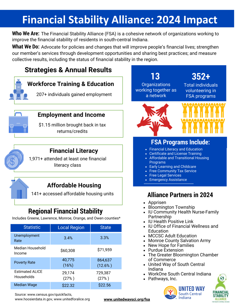 The Financial Stability Alliance (FSA) is a cohesive network that aims to increase the financial stability of residents in south-central Indiana. The group was formed in the fall of 2010 as a collective network led by United Way. The alliance accomplishes this by advocating for policies and changes that will improve people’s financial lives; strengthening its members through development opportunities and sharing best practices; and measuring collective results, including the status of financial stability in the region.